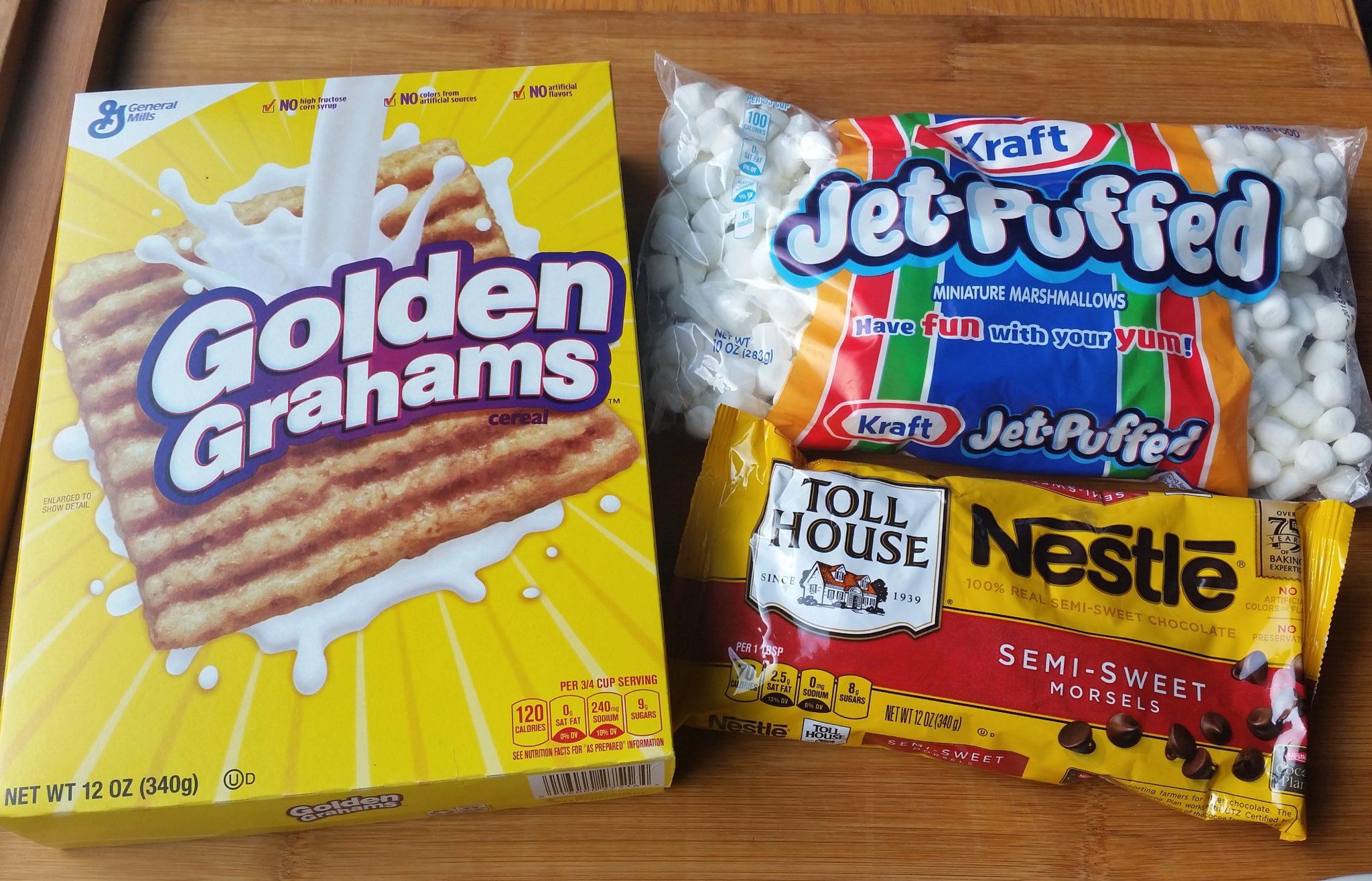 The ingredients: 1 bag of chocolate chips, 1 bag of mini-marshmallows, 1 box of Golden Grahams cereal.