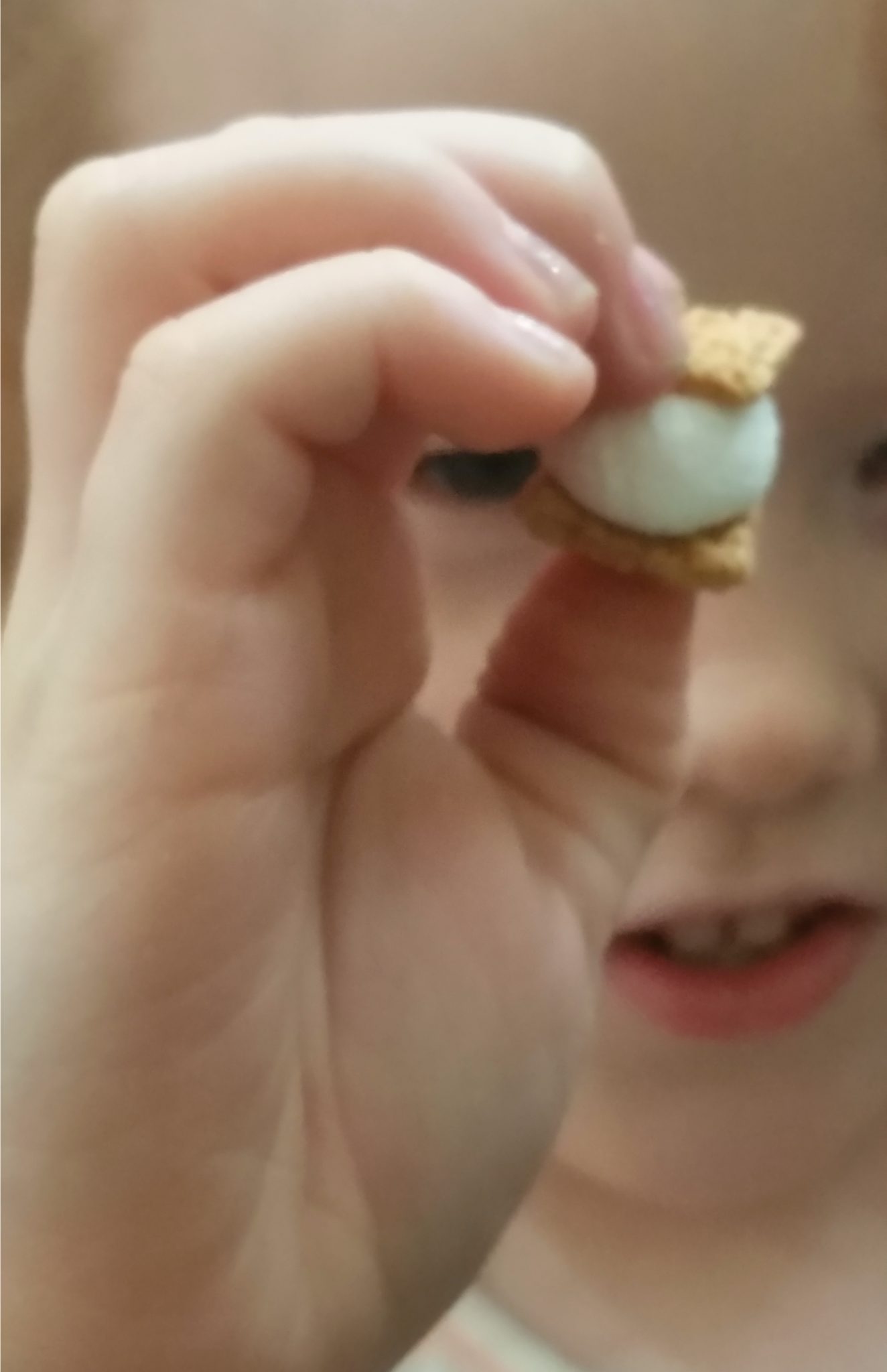 You can eat it by the handful, or take your time and make individual mini-s’mores like one of my young friends at church (there’s a chocolate chip in there too, you just can’t see it).